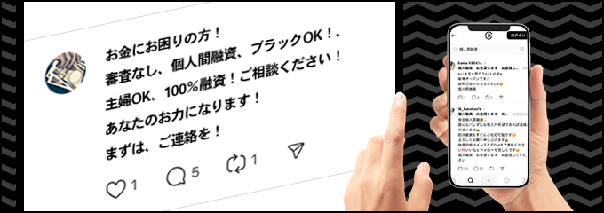 特に注意が必要なのが、SNSを利用した闇金です。「#個人間融資」といったハッシュタグで検索すると、簡単にお金を貸してくれるという投稿が見つかりますが、そのほとんどが違法な高金利で貸し付ける闇金です。個人を装っていますが、実際は組織的に運営されていることが多いのです。